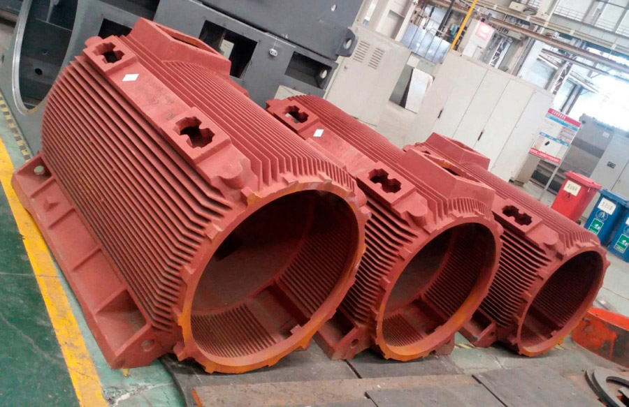 电动机通常采用铸铝转子。采用离心铸铝工艺或压铸铝工艺将液态纯铝浇注到转子铁芯槽中,一次性浇铸成型,将转子导条与端环铸成一个整体。铸铝转子结构和工艺保证了电动机转子不可比拟的可靠性,同时使电动机具有满意的转矩特性。大容量电动机采用铜条转子;可靠的导条紧固和端环焊接工艺以及高速电动机的护环结构,确保了铜条转子的可靠运行。