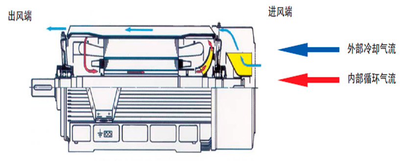 内冷却风路通过内风扇使空气流过转子通风孔,使内部热量源源不断的向机座和端盖传导,机座起到内、外空气热交换器的作用;被冷却的空气与外部冷却空气同向,通过机座内4个通风管道返回,顺序冷却,使电动机的散热均匀。